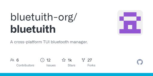 arrow-up15arrow-down1external-linkbluetuith - A TUI based Bluetooth Manager v0.2.6 is released (Windows/MacOS support)plus-squaregithub.comdarkhz@feddit.nl · 1 month agomessage-square0linkfedilink