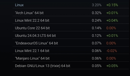 arrow-up1461arrow-down1imageLinux continues to grow and has reached a new peak of 3.20% in the November 2025 Steam Hardware & Software Surveylemmy.mlmr_MADAFAKA@lemmy.ml to Linux Gaming@lemmy.worldEnglish · 3 months agomessage-square61linkfedilinkfile-text