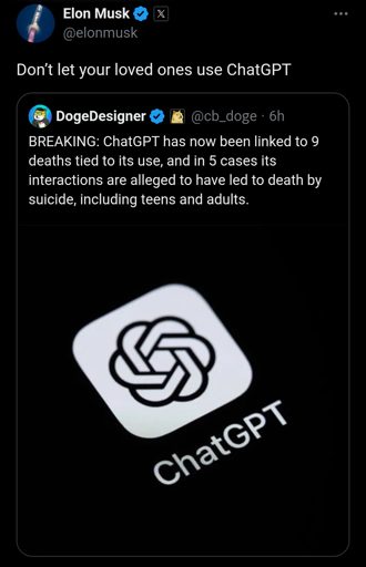 arrow-up166arrow-down1imageElon Musk and Sam Altman clashed on X after Musk shared a post about a man who committed a murder-suicide following delusional conversations with ChatGPTlemmus.orgBeep@lemmus.org to Technology@beehaw.orgEnglish · 6 days agomessage-square9linkfedilinkfile-text