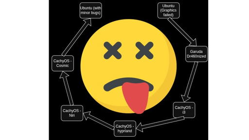 Phase 5: Reinstalling CachyOS A distribution that is often mentioned, is cachyOS. It is Arch based, has the pacman package manager and overall seems to be a stable choice. I gave it a try and was a little overwhelmed what to pick at the desktop environment selection screen. It seems they have 10+ desktops available to pick.