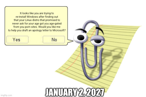 No no you see when this does get implemented and it will. Years later when they ask for a cryptographic signature verifying your age on Linux. Fucking Haiku will be the next big thing alongside Plan 9 Front. Its just how the cookie crumbles.